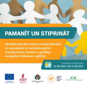 Projekts tiek īstenots Eiropas Savienības kohēzijas politikas programmas 2021.–2027. gadam ietvaros, pasākumā “Atbalsts jaunām pieejām sabiedrībā balstītu sociālo pakalpojumu sniegšanā”. Projektu īsteno Latvijas Bērnu atbalsta fonds sadarbībā ar Latvijas Autisma apvienību, un to līdzfinansē Eiropas Savienība no Eiropas Sociālā fonda Plus (ESF+) līdzekļiem un Latvijas valsts budžeta.