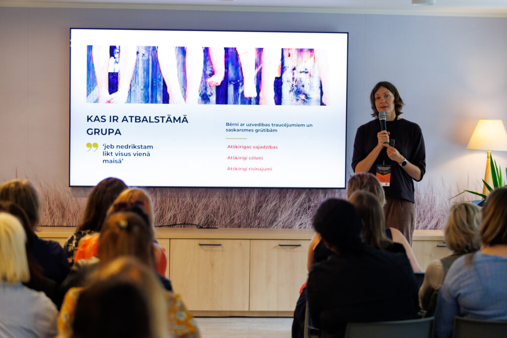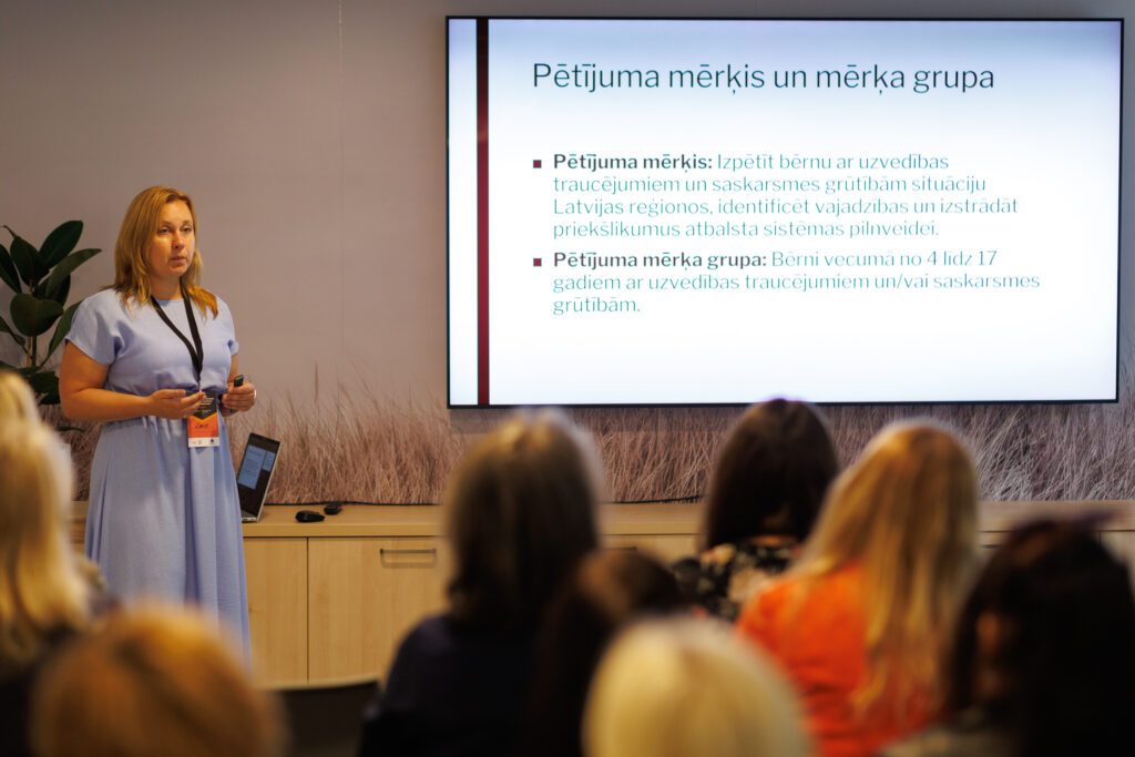 LBAF pētniece Dace Strautkalne prezentēja pētījumu, kurā apzinātas ģimeņu, pedagogu un speciālistu vajadzības visos Latvijas reģionos. Pētījumā noskaidrots, ka visbiežāk bērniem diagnosticēti UDHS (44,9%) un autiskā spektra traucējumi (31,9%), taču 35% bērnu ir bez noteiktas diagnozes. Informācija par atbalsta iespējām ir sadrumstalota un grūti pieejama, trūkst speciālistu, īpaši psihologu un speciālo pedagogu, un vecākiem bieži nākas gaidīt palīdzību mēnešiem. Institūciju sadarbība ir nepietiekama, kas apgrūtina koordinētu atbalstu bērniem. Vecāki izjūt izdegšanu un sabiedrības neizpratni, kas padziļina emocionālo slodzi.